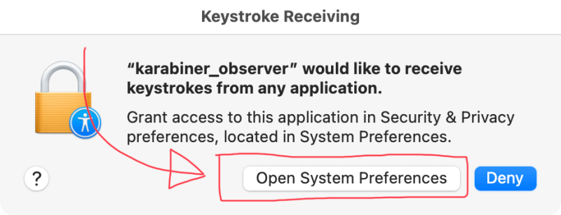시스템 환경설정 열기 버튼을 누르면 시스템 환경설정이 열립니다. 개인 정보 보호 > 입력 모니터링을 선택한 다음 karabiner_grabber 및 karabiner_observer를 활성화합니다. (왼쪽 하단 모서리에 있는 자물쇠 아이콘을 클릭하고 유효한 관리자 계정 사용자 이름과 암호를 제공하여 구성 잠금을 해제해야 합니다.)