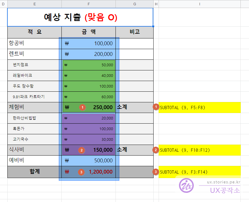 시트의 열(세로)에 대한 부분 합을 계산해 줍니다. 아래의 2개의 동일한 합계를 구하는데, 첫 번째의 합계는 1,600,000원이고 두 번째의 합계는 1,200,000원입니다. 정상적이라면 오른쪽처럼 1,200,000원이 나오는 것이 맞습니다. 체험비와 식사비는 소계가 적용되어 있기 때문에 모두 더한다면 중복 계산이 되기 때문입니다.