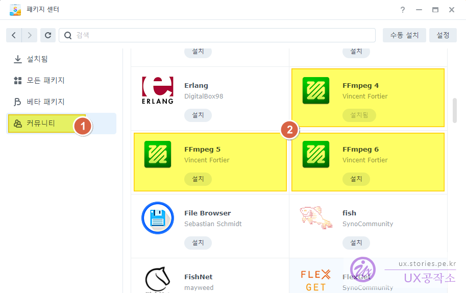 그러면 아래와 같은 사설 패키지센터(커뮤니티)가 설치가 됩니다. 이제 그 중에서 FFmpeg를 선택하여 설치합니다.