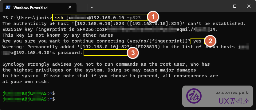 윈도우즈의 경우 아래와 같이 터미널 창에서 본인의 시놀로지로 SSH 접속을 시도 합니다.