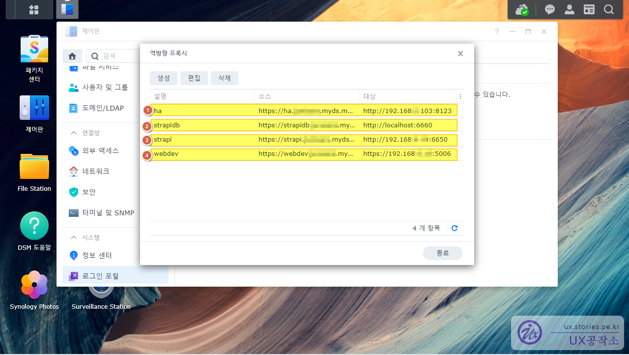 4. 시놀로지 나스 역방향 프록시 설정 : 서브 도메인으로 시놀로지 나스 서비스에 접근할수 있게 설정합니다.